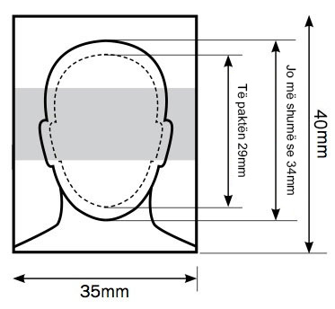 • Nëse mbani veshur mbulim për kokën dhe qafën për arsye fetare duhet të siguroheni që fytyra të jetë qartësisht e dukshme nga fillimi i mjekrrës deri mbi vetullë duke përfshirë dhe mollëzat. Nëse është e mundur dhe dy veshët duhet të duken. Do të jenë e nevojshme dhe heqja e syzeve tuaja për fotografinë.